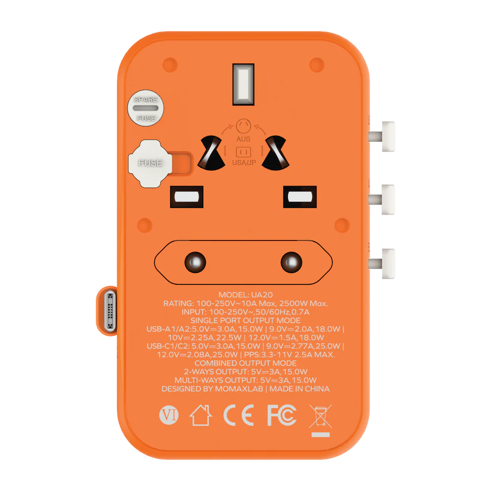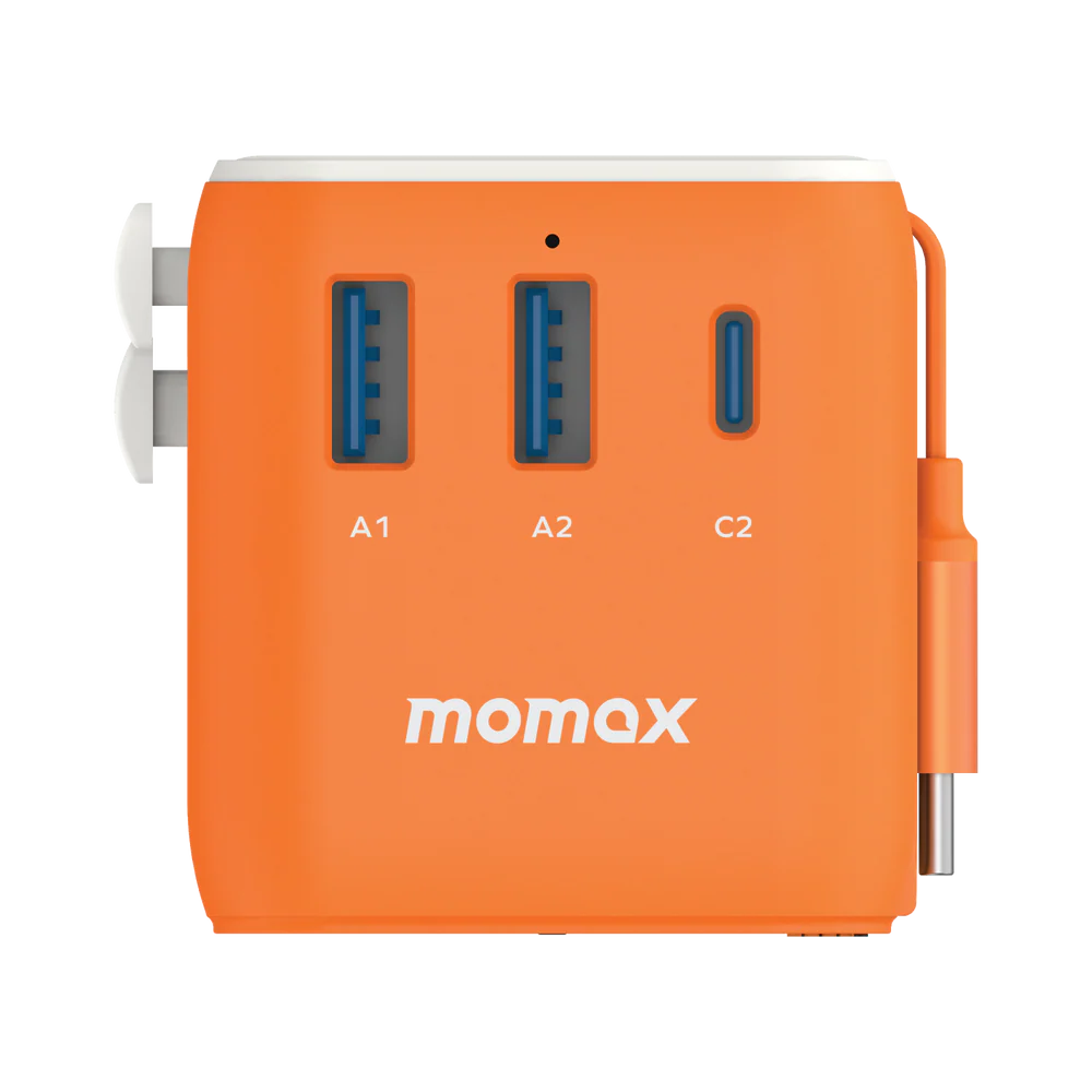 محول السفر العالمي من موماكس بقوة 25 واط مع كابل USB-C قابل للسحب